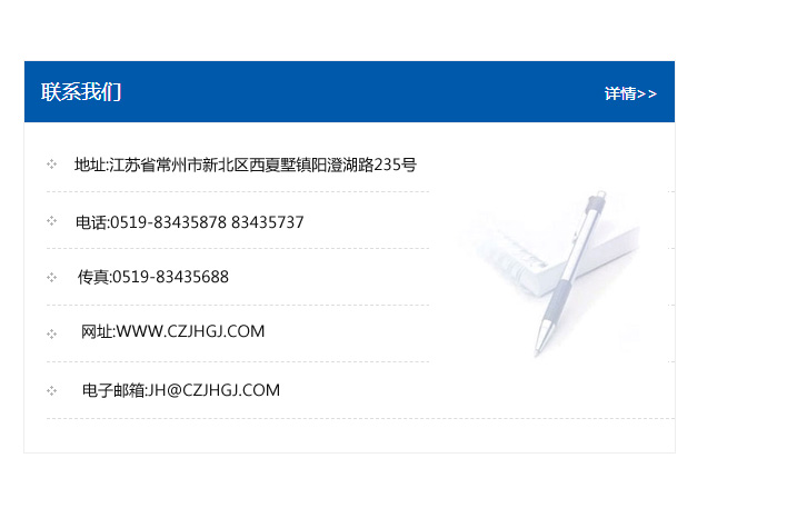 地址:常州市新北區友邦商務大廈1幢16、17層  電話:0519-85101652  傳真:0519-85112595  郵編:213022  網址:www.cz-jiayue_cn.tdqcxw.com  郵箱:xiajifengaa@163.com
